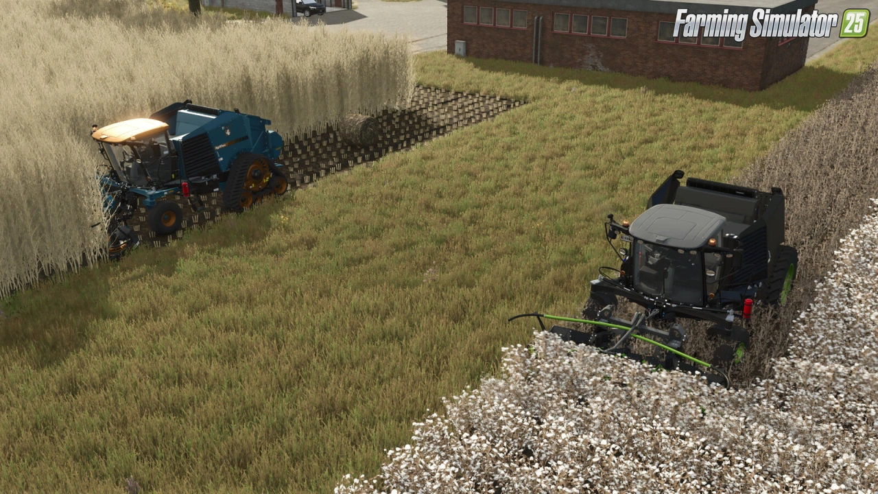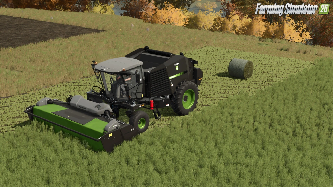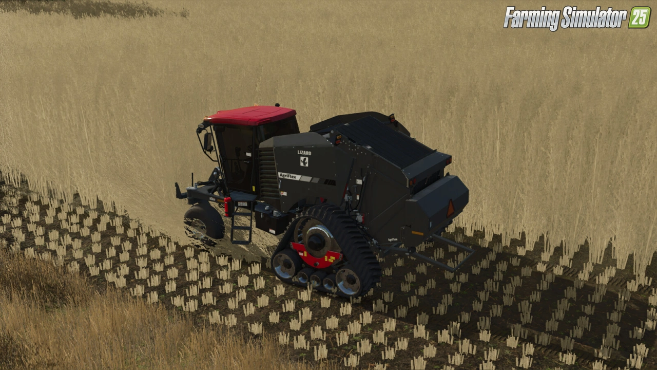 Lizard AgriFlex SPB for FS25 - introducing the Lizard AgriFlex, a premium self propelled baler (SPB) with a next-gen hybrid cutter pickup assembly. In addition to picking up standard windrow fill like grass/hay/straw, this hybrid pickup can also strip cotton from its stem as well as cut and chop poplar. Additionally, an optional 3-point front attachment allows the use of a front mower to mow and bale grass in a single pass.