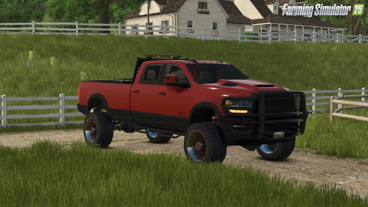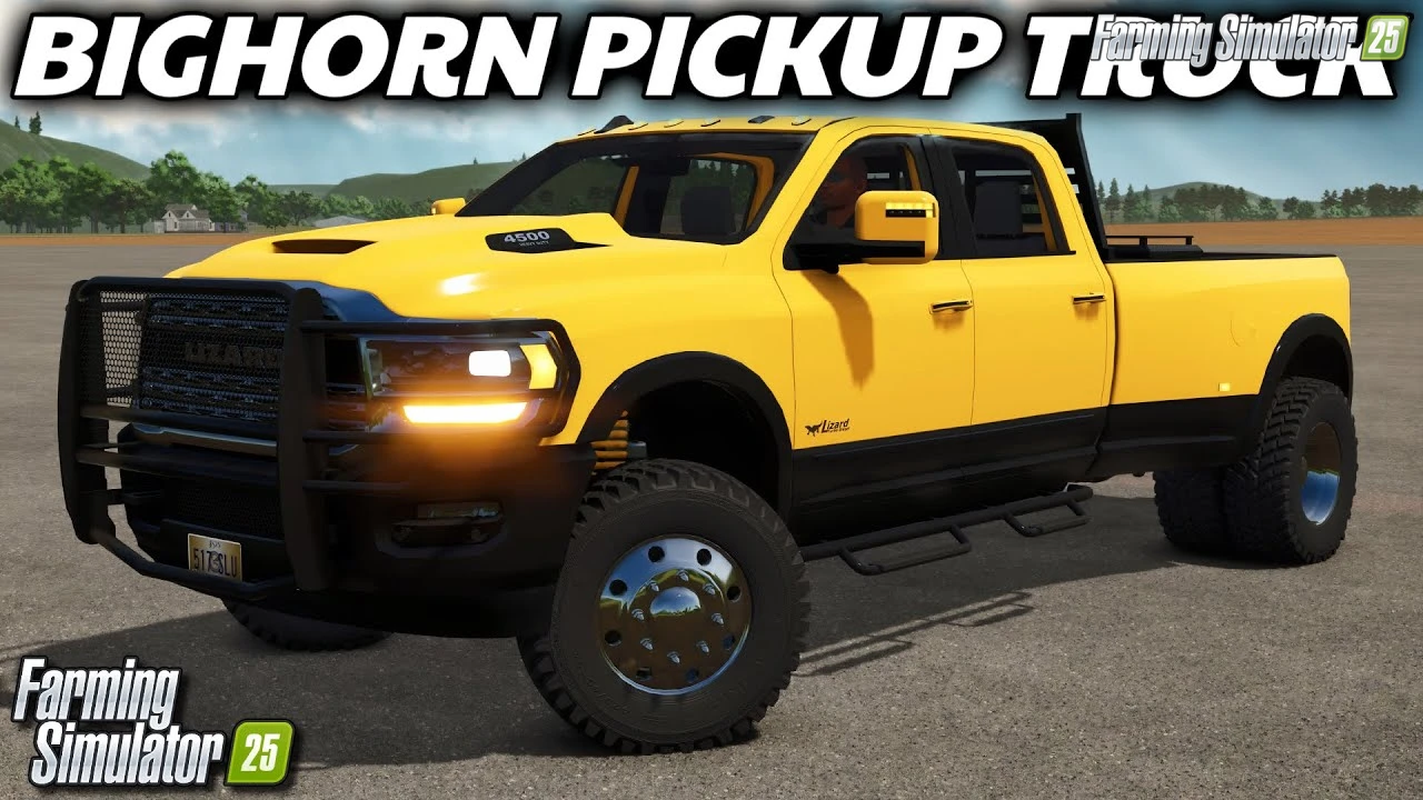 BigHorn Pickup for FS25 - this mod brings the robust 2024 Lizard BigHorn pickup truck to FS25 players as a heavy-duty versatile hauler, perfect for towing trailers, transporting goods and pallets, heavy equipment hauling, and farm utility with advanced attachers, detachable customizable bed, high-power performance, and extensive styling options.